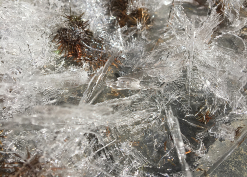 落ち葉も道端にかさなりだし「ザク ギャシャ」と小刻みにまんべんなく踏み歩きたくなります。日中でもとけない日陰の霜柱を「ザクザク」。長靴の大きな足跡がつき、蹴散らかされて倒れた霜柱の長さに驚きます。