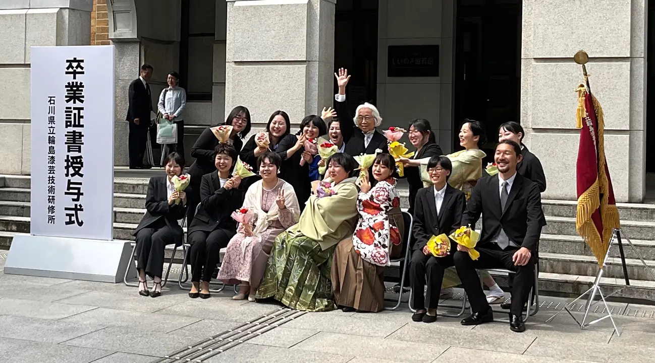 2022年3月にアートクラフト科を卒業した富樫知優 (とがしちひろ)さんは、今年5月、石川県立輪島漆芸技術研修所をめでたくご卒業されました。ですが在学中の2024年元日、マグニチュード7.6を記録する能登半島地震が発生しました。富樫さんはその日、お正月休みで東京の実家に戻っていたため幸い直接被災することはありませんでしたが、この災害からどのような影響を受けているのか、現在のことや今後のことなどについてお話を伺いました。(集合写真、後列の一番左が富樫さん)