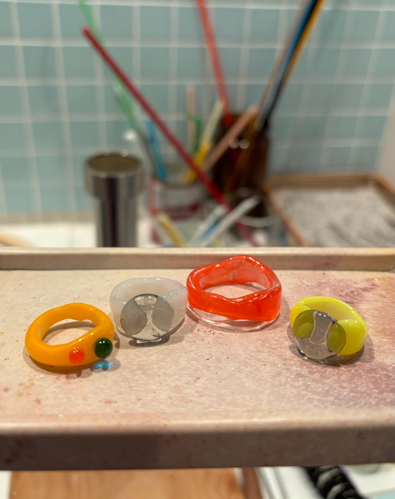 A. 家でバーナーを買い、A科で学んだトンボ玉やガラスの指輪づくりを母と始めました。その他イラストを描いたりブローチを作っており、定期的に高円寺のフリーマーケットで作品を販売したりしています。ありがたいことに工芸高校のクラスメイトや後輩が足を運んでくれて、みんなと会えるきっかけにもなったので、やってて良かったです。通りがかった方に足を止めて頂いたり、作品が売れるととてもやりがいを感じます。