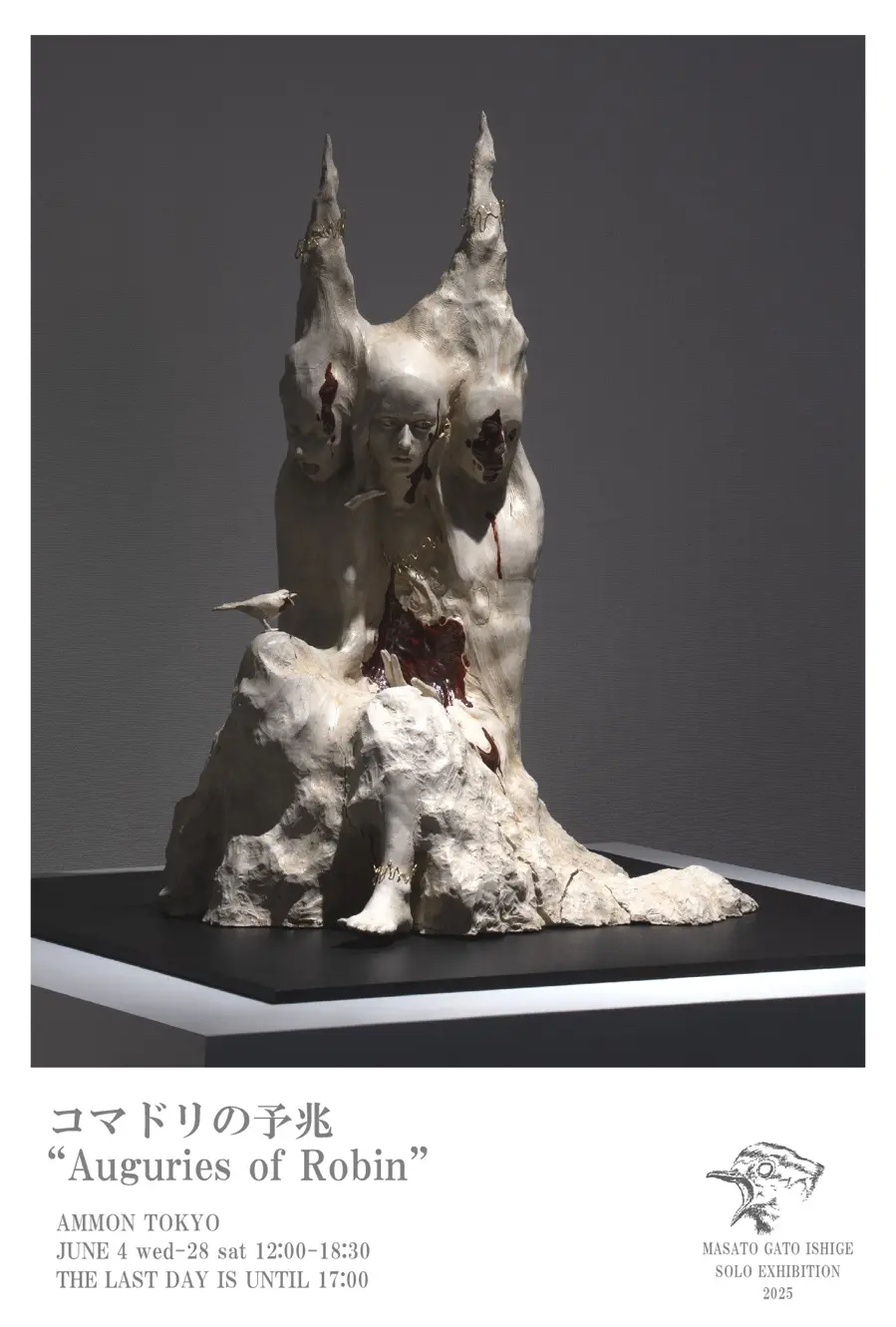 この度AMMON TOKYOギャラリーにおいて、独特の生命感と寓話的な静寂が共存する彫刻家石下雅斗の個展を「コマドリの予兆」と題し開催しております。