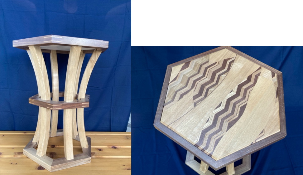 普段は生徒にものづくりを教え、デザインに特化した木材加工を教えております。デザインの順序として、設計→計画→製作という流れが一般的ですが、今回はあえてその順序を無視して端材を組み合わせる時にどのようなデザインになるのかを考えながら作るような方法を取りました。その際に生徒から六角形を宙に浮かべたら面白いという意見をもらい、この形になることができました。多くの人にみてもらって更なるものづくりの豊かさの発見の一助になっていただけると幸いです。