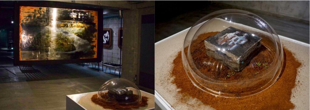 素材の特性や質感が、⼼理形態や⼈間関係を含む⼈⽣の断⽚を再現しているかのように⾒えることがあります。⼟は⼟、鏡は鏡でありながら、私たちはそこに⾝体的感覚や記憶を重ね、共鳴するように何らかのビジョンを眼差そうとします。芸術作品を作るにしても見るにしても、想像⼒が要求されるのは、⼈間⼀⼈⼀⼈がそれぞれの「⼈たる世界」を構築する過程にそれが⾃然と機能しているからではないでしょうか。私はその作⽤を重要な要素として扱っています。例えば、たくさんの微⽣物を含む⼟の上に印刷された像が、次第に植物に覆われていったり、カビや菌類に覆われていくならばどうでしょう。印刷によって⼀時的にインクの膜が⼟を覆いますが、次第にその像の中に⽣命が繁栄していきます。もしくは、⼩⽯を集めて平らにならべ、その上に印刷を施したらどうなるでしょう。⽯が固定されていないとするならば、印刷された像は常に崩壊の危機にさらされます。ただ⼟よりも脆くはないので、バラバラになっても元通りの位置に並べれば、像を復活させることが可能です。鏡に印刷をすれば、像の中に鑑賞者⾃⾝が映り込み、像を鑑賞者に対し印刷することができます。
