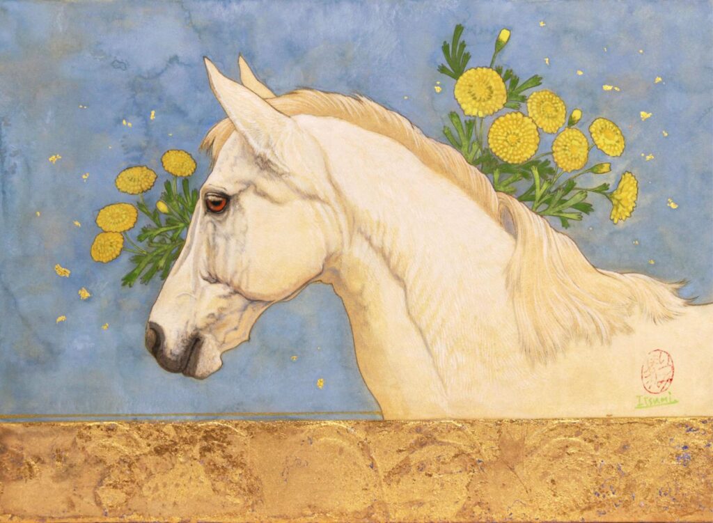 晴天を祈る時には⽩い⾺を、⾬乞いをする時は⿊い⾺を、古代の⽇本では神に⽣きた⾺を捧げたそうで す。やがて⾺を奉納する代わりに⾺の絵を描くようになったのが「絵⾺」の始まりだとか。今年の⼲⽀ は午。⻘空の下を颯爽と駆ける⽩⾺のように凜として前へ進んで参りましょう。 みなさまにとりまして⾶躍の年となりますことを⼼よりお祈り申し上げます。
